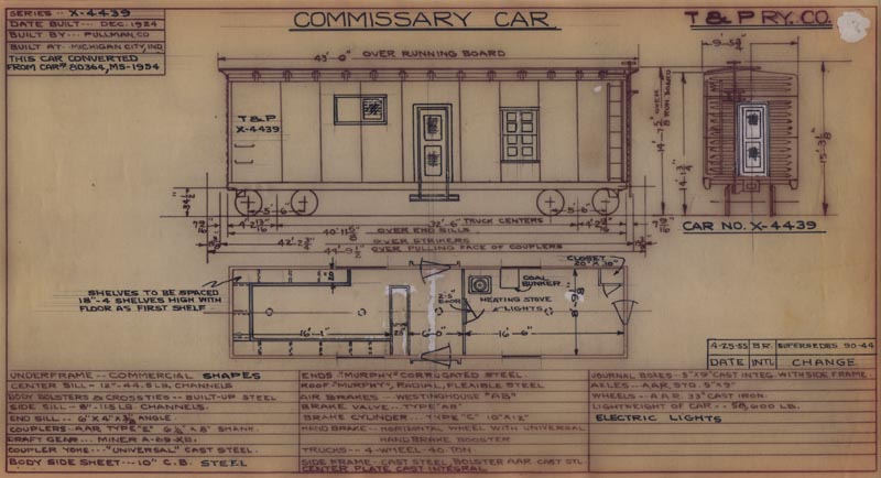 T&P Commissary Car #X-4439 - converted from boxcar (blt. 1924) in 1954 at T&P's Marshall shops - Missouri Pacific Diagram/Daryl Favignano Collection |