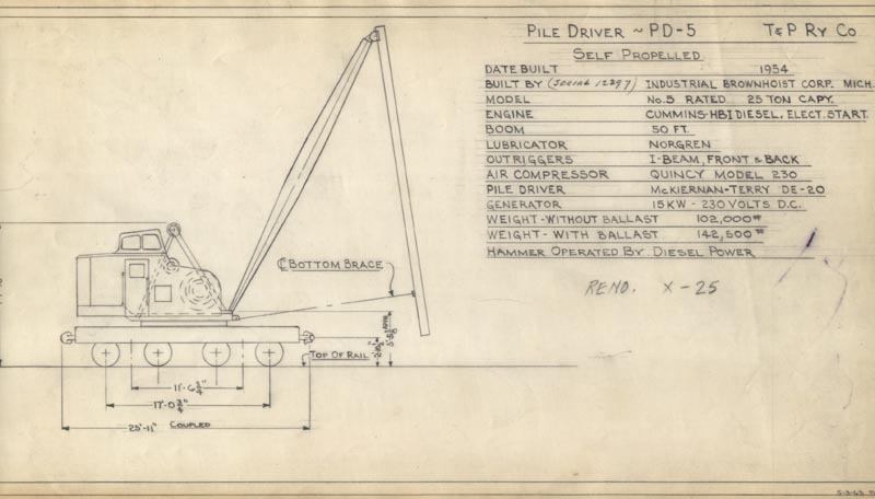 T&P Pile Driver #X-25 - diagram dated 5/3/63; built 1954 - Missouri Pacific Diagram/Daryl Favignano Collection |