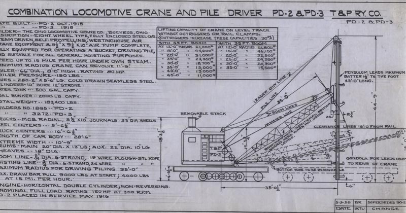 T&P Locomotive Crane & Pile Driver #PD 2 & 3 - diagram dated 5/3/55 - Missouri Pacific Diagram/Daryl Favignano Collection |