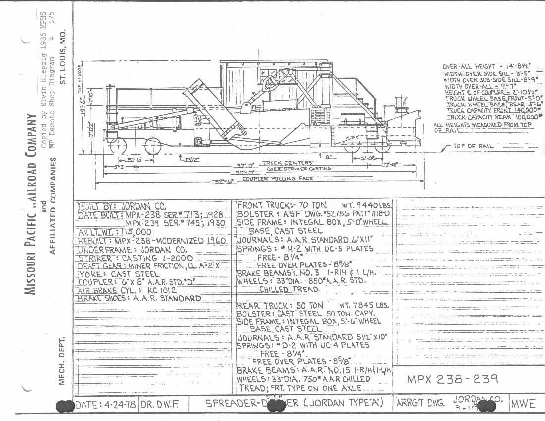 MP X 238 & 239 - the second of two DeSoto Shops spreader diagrams dated 4/24/78. During later rebuilds, the shops added a cab to these cars - scan provided by Elvin Klepzig |