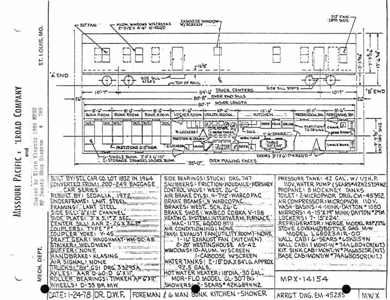 MP X 14154, Crew Car - DeSoto Shops diagram. Many MoW cars were one-of-a-kind, modified from older equipment, with an individual car requiring it's own individual (rather than a series) diagram such as this one for #14154 - scan provided by Elvin Klepzig |