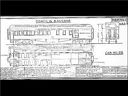 | Schematic Drawing of Abalene & Southern Coach & Baggage #52 - Courtesy Walter Robbins Collection, Brown Library, Abilene Christian University, used with permission |