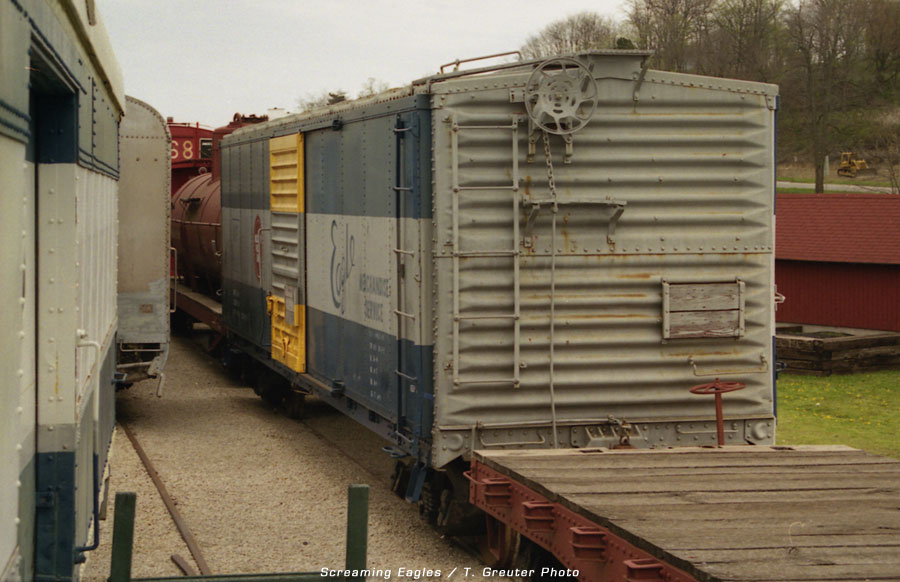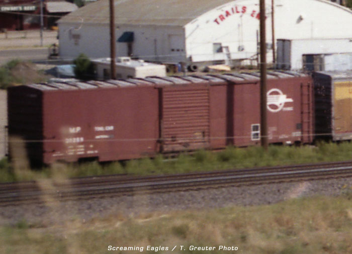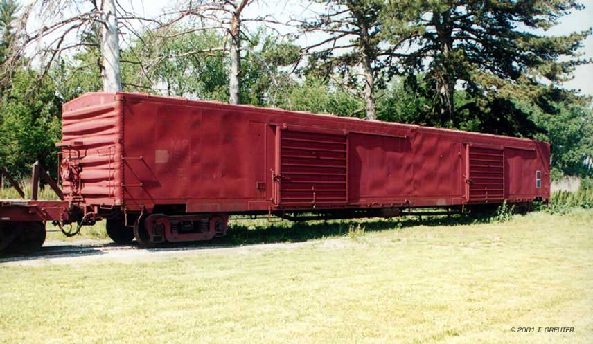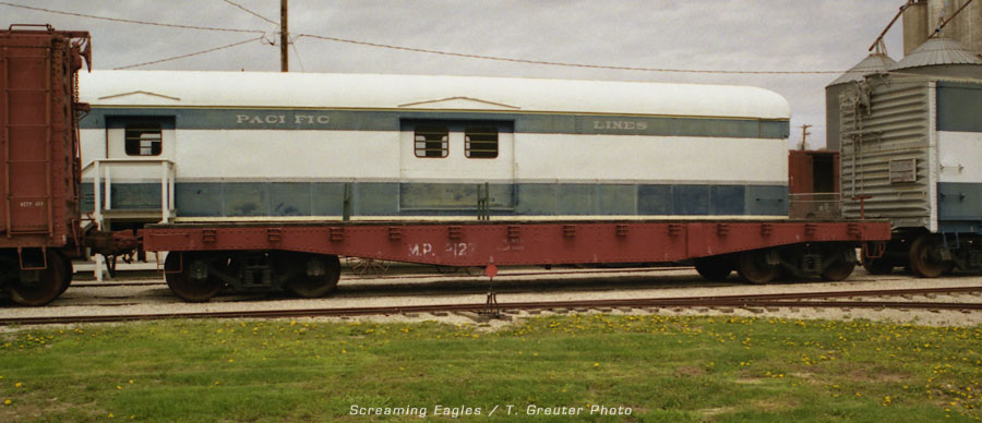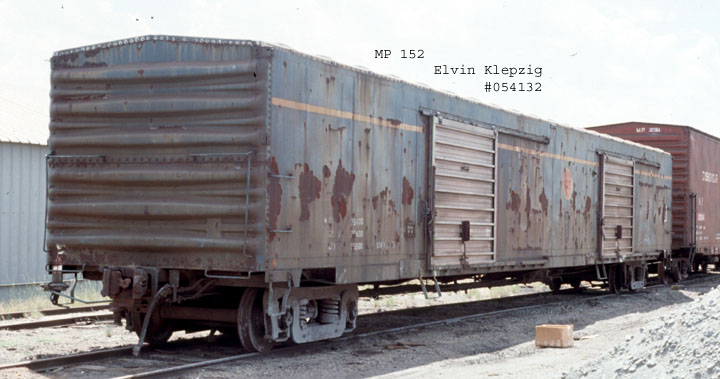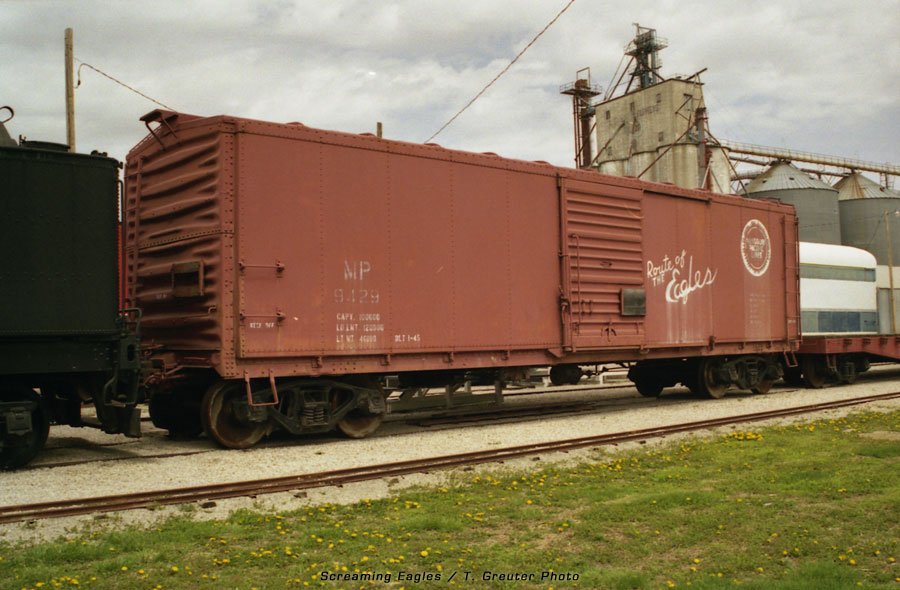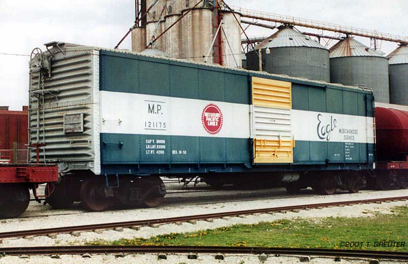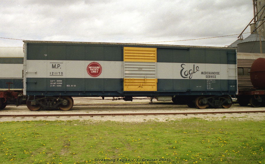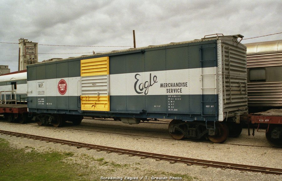 Merchandise Service Cars The doors of the Eagle Merchandise cars were yellow and gray. The door's top and bottom portions (that aligns with the blue car sides) were painted yellow, and the gray stripe extended the entire car length through the door. The roof seam caps were painted gray. The diagonal panel roof remained unpainted galvanized steel. The car ends were painted gray. Placard boards on doors and ends were painted black. The MPL buzzsaw was red with white letters and white circle inside the saw blade. Stencils over gray were black and stencils over blue were white. (from MP stenciling drawing GF-32401, dated 8/29/51 - thanks to Ed Hawkins) |