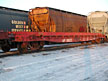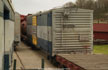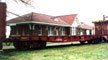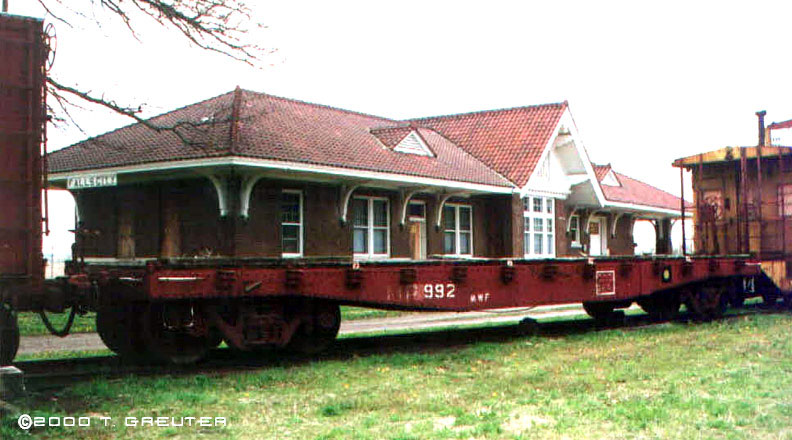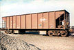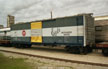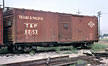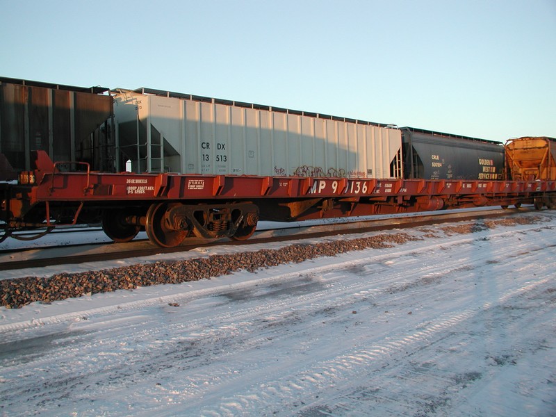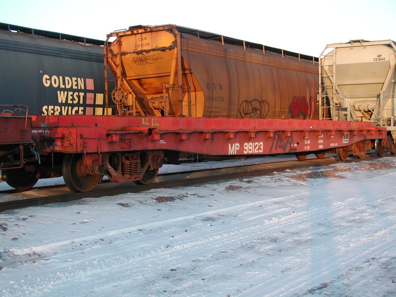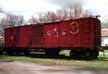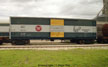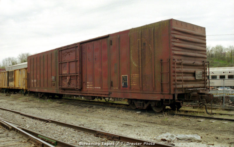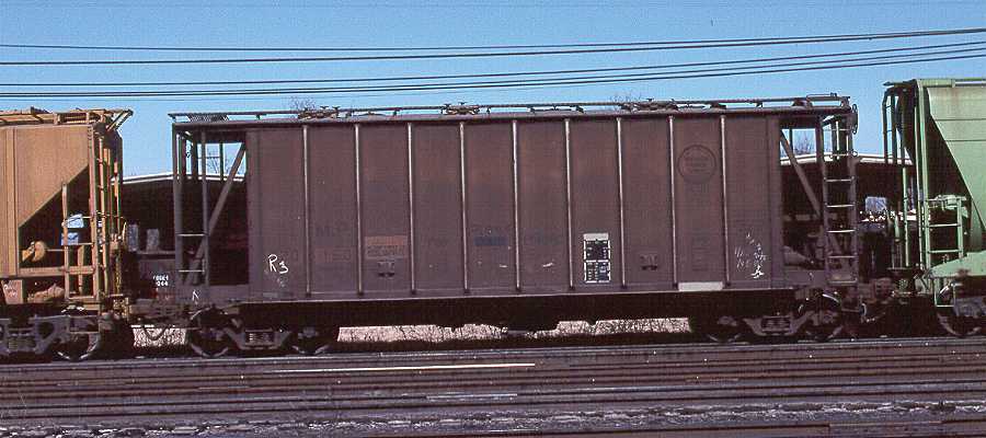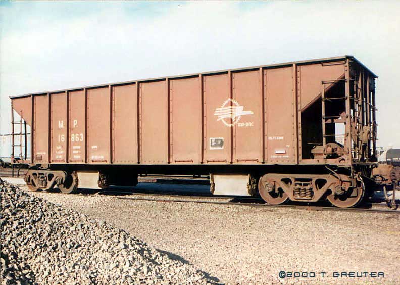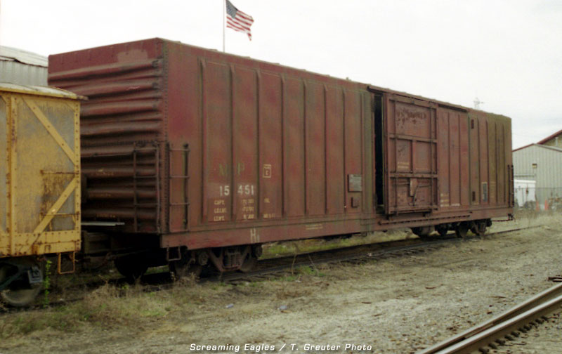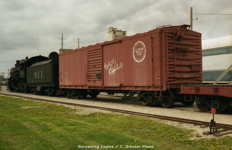 Merchandise Service Cars The doors of the Eagle Merchandise cars were yellow and gray. The door's top and bottom portions (that aligns with the blue car sides) were painted yellow, and the gray stripe extended the entire car length through the door. The roof seam caps were painted gray. The diagonal panel roof remained unpainted galvanized steel. The car ends were painted gray. Placard boards on doors and ends were painted black. The MPL buzzsaw was red with white letters and white circle inside the saw blade. Stencils over gray were black and stencils over blue were white. (from MP stenciling drawing GF-32401, dated 8/29/51 - thanks to Ed Hawkins) |
