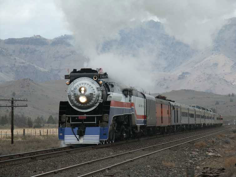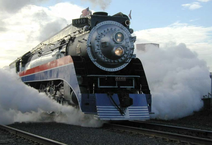 #4449 Engine Specifications Length: 101' 5" Height 16' 2" Width 10' 10" Drivers: 80" Dia. Weight on Drivers: 275,700 lb. Locomotive Weight: 475,000 lb. Locomotive & Tender Weight: 865,758 lb. Cylinders: (2) 25.5" x 32" Tractive Effort: 64,800 lb. Tractive Effort with Booster: 77,760 lb. Tender Capacity, Water: 23,300 gals. Tender Capacity, Fuel Oil : 5,880 gals.