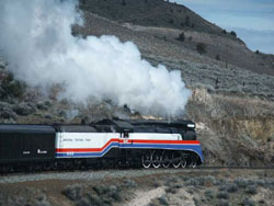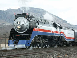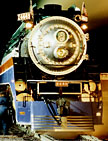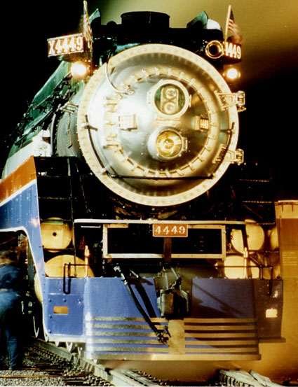 AFT Locomotive #4449, one of the most photographed locomotives in the world, the former Southern Pacific GS-4 is the property of the City of Portland Oregon. It was repainted to Daylight colors a few years after the Bicentennial. In the 1980s it pulled a consist of matching cars from Portland to New Orleans for the World's Fair and starred, along with Burt Lancaster and Kirk Douglas, in Disney's "Tough Guys". In recent years she has sported an all-black paint scheme, and most recently headed an ERS excusion on the BNSF in 2001. Today she is back in sparkling red, white and blue. |