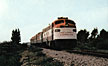 Union Pacific's E-9 #951 - was painted in a special "Preamble Express" paint scheme. The unit toured the nation, testing the route for the American Freedom Trains run in 1976. The 951 is pictured on Seaboard Coast Line rails at Hollywood, California in 1975. - Jay Glenewinkel postcard collection. |