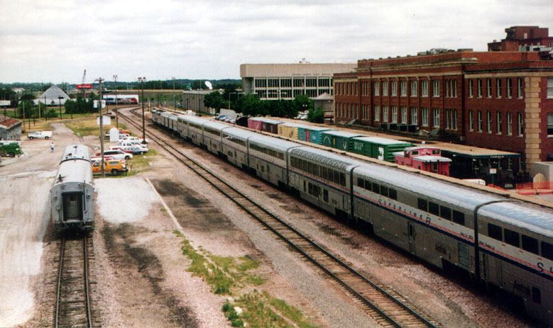 AMTK slides to a brief stop at Lincoln Station's boarding platform on it's way to Omaha, Nebraska. 6/21/97 - T. Greuter Photo |