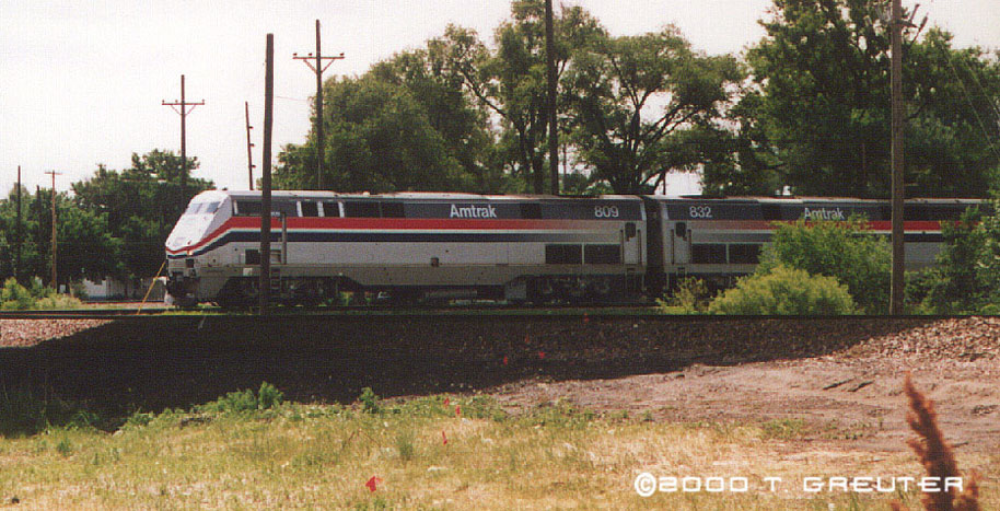 AMTK 809 and 832 on the BN mainline headed for Lincoln Station in Nebraska. 6/21/97 - T. Greuter Photo |