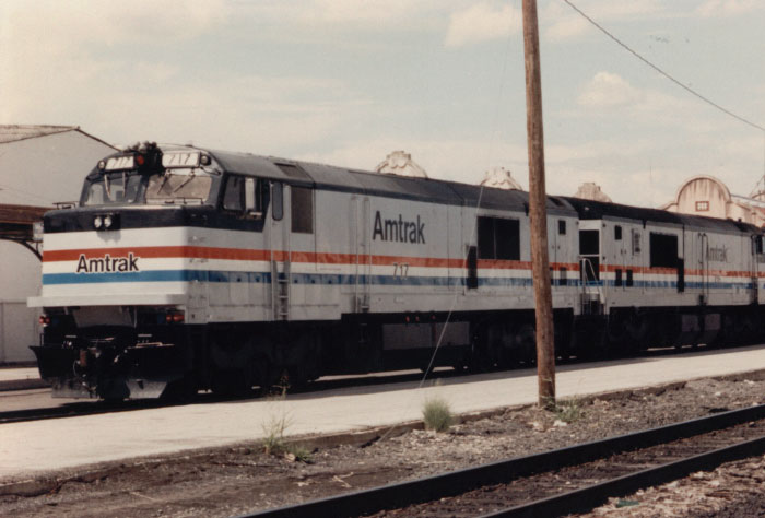 Amtrak P30CH #717 is on the Westbound Sunset Limited in San Antonio in September 1985. - Jay Glenewinkel Photo |