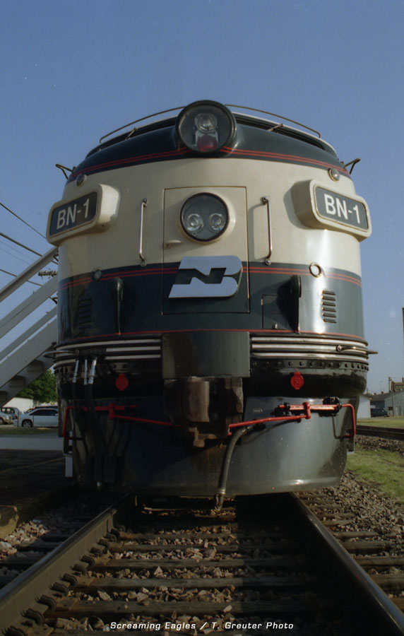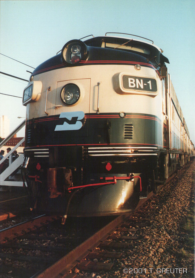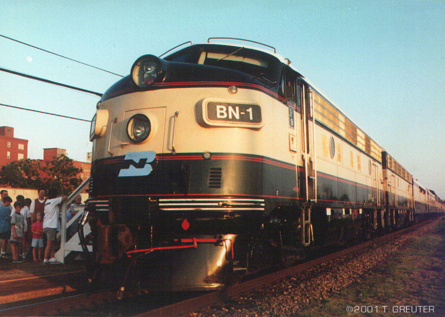 BN 1 - the classic F-9 streamliner basks in the rays of a setting sun at Lincoln Station. 6/29/96 - T. Greuter Photo |