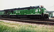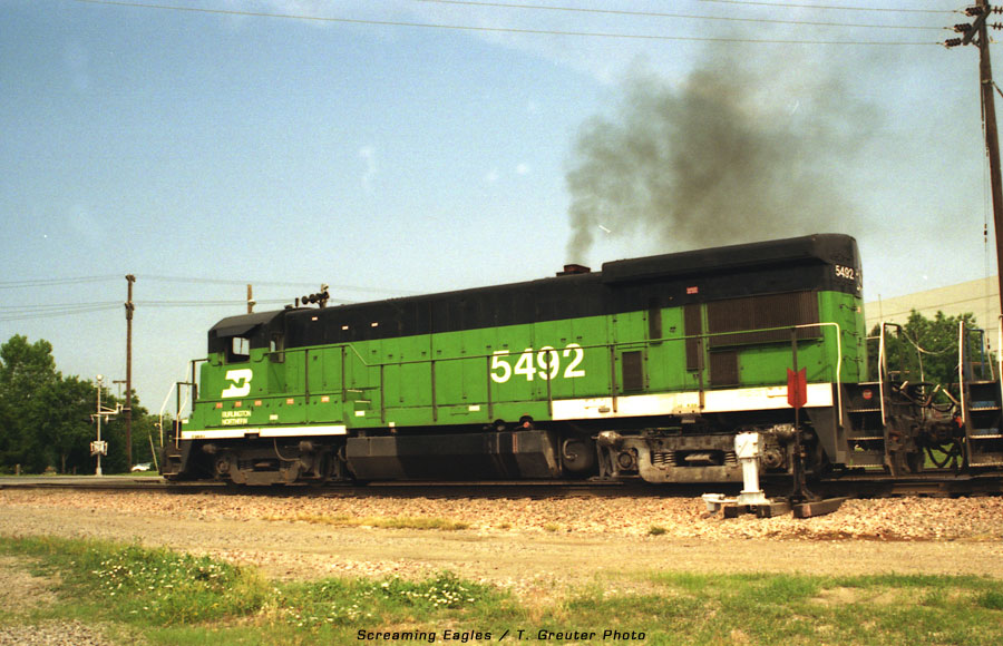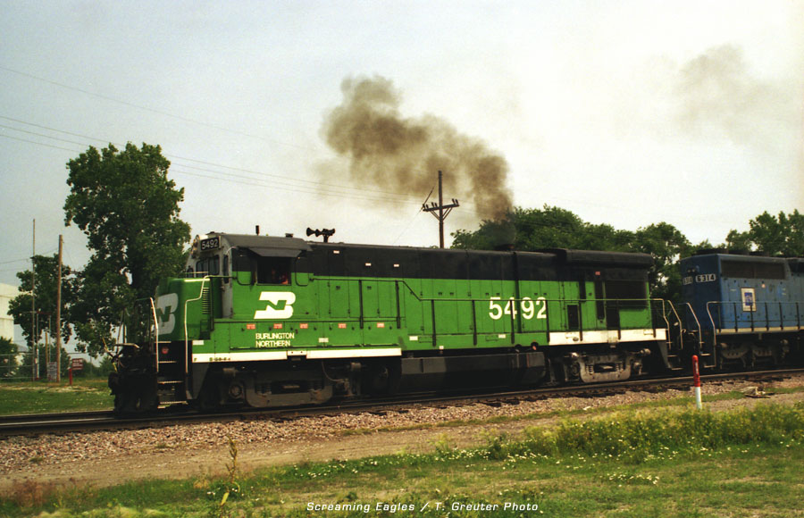 BN 5492 - an ex-Frisco B30-7 smokes its way into Lincoln, Nebraska. 6/20/96 - T. Greuter Photo · |