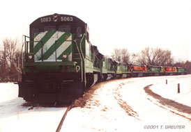 BN 5063 - a string of seven C30-7's stored on an industrial track. 2/3/01, Lincoln, Nebraska - T. Greuter Photo |