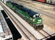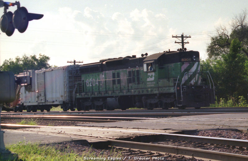 BN 6204 - the shadows are long late in the day as the SD9 pulls out a MOW train at Hobson Yard, Lincoln, Nebraska, August 1995 - T. Greuter Photo · |