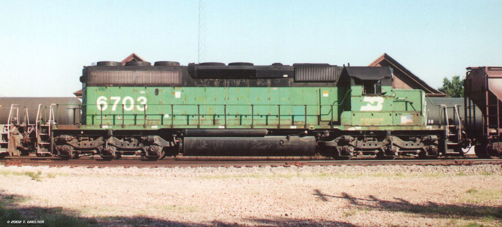 BN 6703 - SD40-2 is part of a colorful string of power at the Ashland, Nebraska depot. 10/01 - T. Greuter Photo |