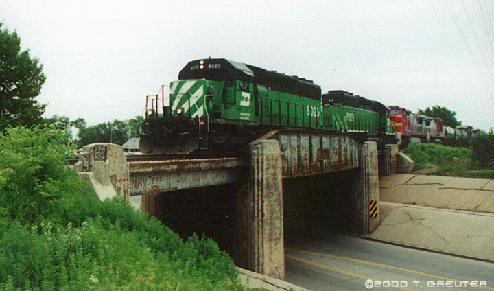 BN 8020 - Another cloudy day in Lincoln hangs over the SD40-2 as she crosses the 48th Street overpass. Lincoln, Nebraska 6/20/00 - T. Greuter Photo |