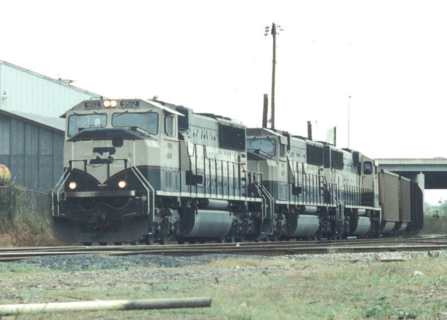 BN SD60M #9512 - leads a trio of new SD60Ms on a San Antonio Coal train in 1999. In 1996-1999 both Burlington Northern and Union Pacific delivered coal to San Antonio. - Jay Glenewinkel Photo |