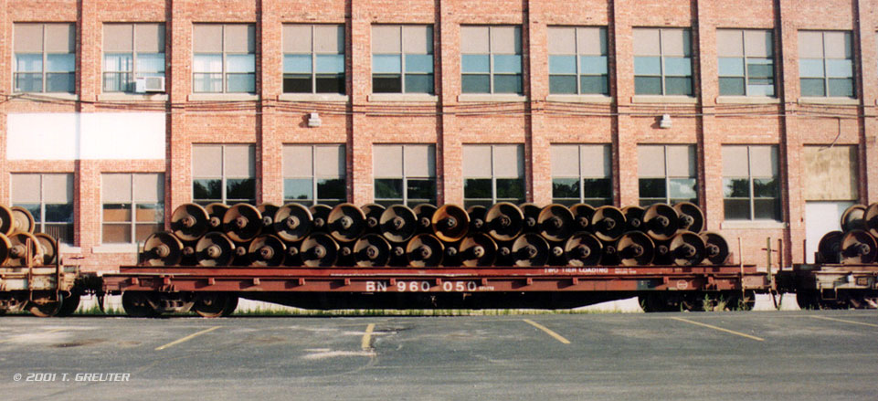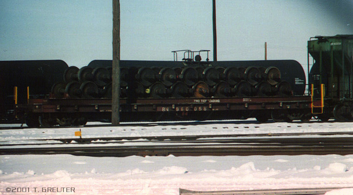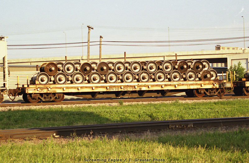 BN 960019 - brand new wheelsets loaded on wheelcar; Lincoln, Nebraska - T. Greuter Photo · |