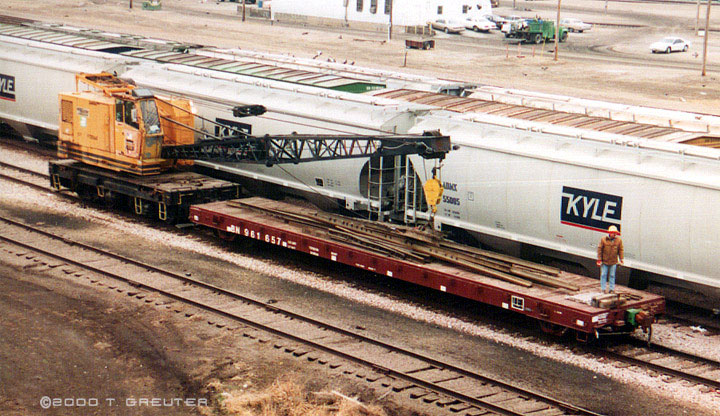 BN 961657- powered crane passes by Lincoln Station. 3/29/96 - T. Greuter Photo |