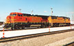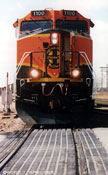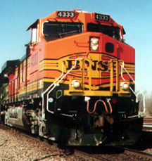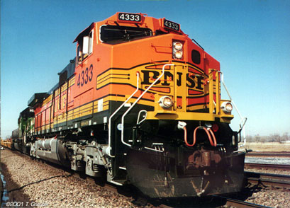 Burlington Northern Santa Fe operates one of the largest rail networks in North America, with 33,500 route miles covering 28 states and two Canadian provinces. Below are images of the BNSF, mainly from the Omaha, Hastings, Kansas City and Revenna Lines in Nebraska - locomotives, equipment and some inside cab shots. Most photos were taken at Lincoln, Nebraska unless otherwise noted. BNSF Paint Schemes-101 (Heritage I and Heritage II) There are two basic variations of the BNSF paint scheme (not including the motely assortment of "patch jobs" inflicted on predecessor units). The reason for the "heritage" designation is for the use of classic elements pulled from predecessors BN's and ATSF's history - the dark green and orange scheme is directly adapted from Burlington Northern predecessor Great Northern (especially as seen in Heritage I), and the old Santa Fe emblem modified for the merged railroads new name. The silver undercarriage is reminiscent of ATSF units as well.