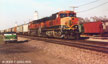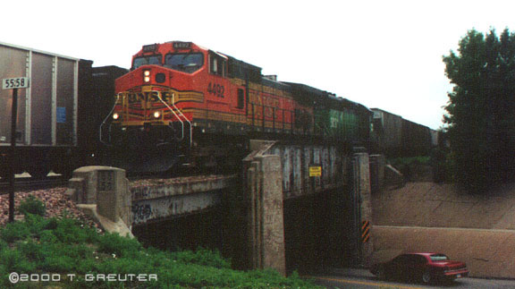 BNSF 4492 - a Dash 9-44CW, looks sullen on this hazy summer day as it crosses 48th Street on the Omaha line, west of the Havelock shops. Lincoln, Nebraska 6/20/00 - T. Greuter Photo |