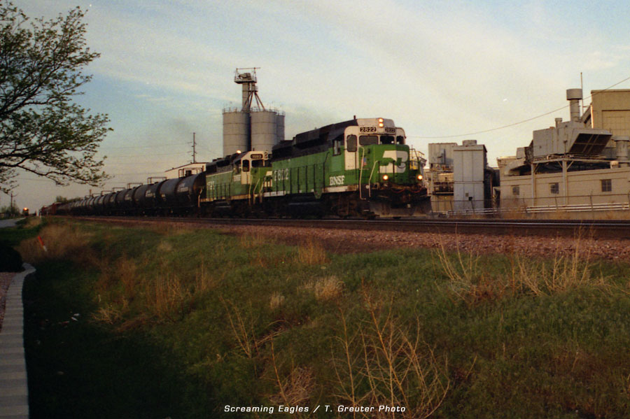 BNSF 2822 - passes a cluster of grain elevators as it surges southbound to Hill Street Junction in south Lincoln, Nebraska, 2002 - T. Greuter Photo · |