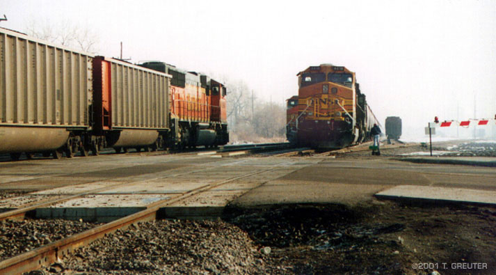 BNSF 4418 - with a Norfolk Southern unit wait at the state fairgrounds with a grain train; Lincoln, Nebraska 3/3/01 - T. Greuter Photo |