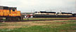 BNSF 9747 - (yet to be painted into the all-new BNSF scheme) and BN 9674, both SD70 MAC's, roll into Lincoln Station, Lincoln, Nebraska as a UP GP38-2 looks on. 4/23/97 - T. Greuter Photo |