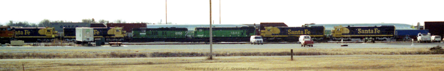 | BNSF Deadline - at Hobson Yard, Lincoln, Nebraska. Notice the shipment of two aircraft fuselages behind the stored units. 2002 - T. Greuter Photo · |
