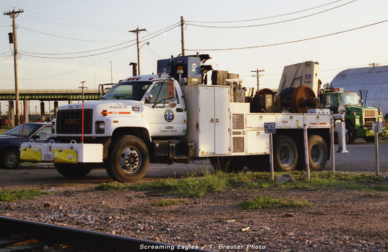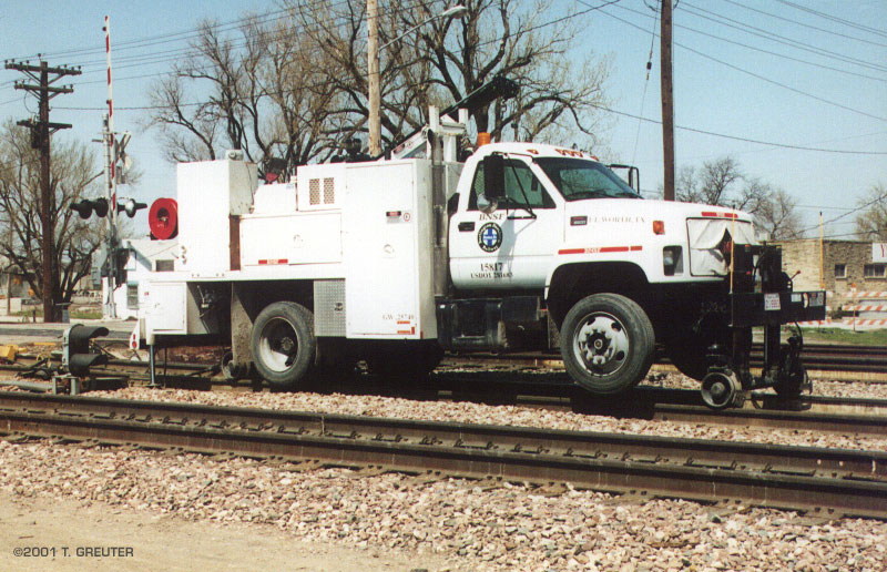 BNSF 15817 - hi-railer at the east mouth of Hobson Yard; Lincoln, Nebraska 4/01 - T. Greuter Photo |