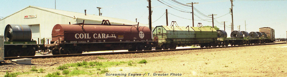 BNSF 534500 - old and new coil cars pull out of Hobson Yard, Lincoln, Nebraska - T. Greuter Photo · |