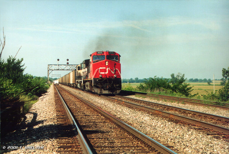 CN 2635 - The train approaches Ashland, Nebraska and will soon pass the former Burlington Route depot on the double track main between Lincoln and Omaha, Nebraska; August 4, 2001 - Todd Greuter Photo |