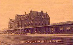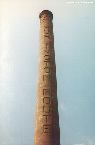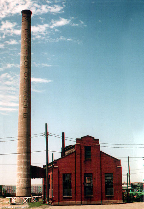 The towering smoke stack , among the many facilities built by the CB&Q in the area, standing across the track from the station dominates the railyard . 6/29/96 The landmark no longer stands. - T. Greuter Photo |