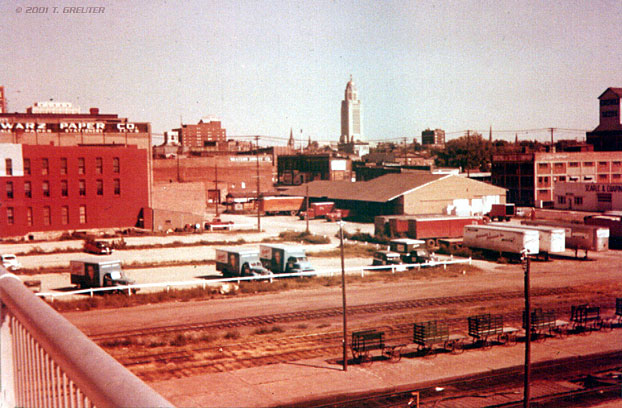 Looking southeast towards the capital building from the "O" Street overpass - also around the '50's. Notice the freight carts neatly parked trackside. - Robert Greuter Photo |
