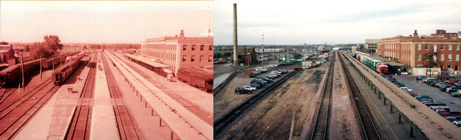 | Lincoln's oldest railyard - shown in the 1950's and 1990's. This is looking at the same view as the postcard above. - Robert Greuter Photo |