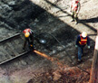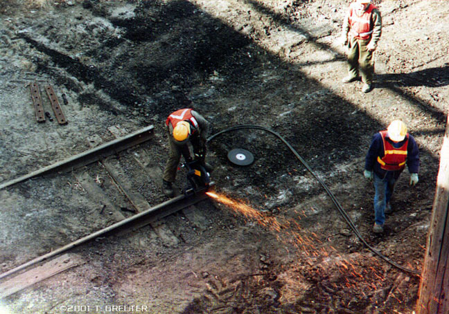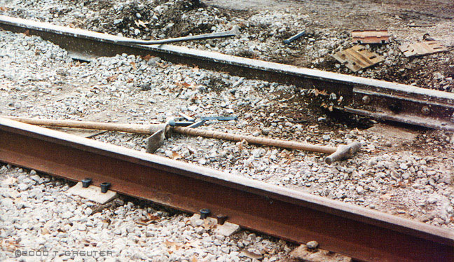 Despite the onset of the diesels, robotic track-layers and ribbon rail, the hand tools of the trade remain the same now as they have for over a hundred years. It looks like the spike-driver has had some creative carving done around it's handle. 12/13/96 - T. Greuter Photo |