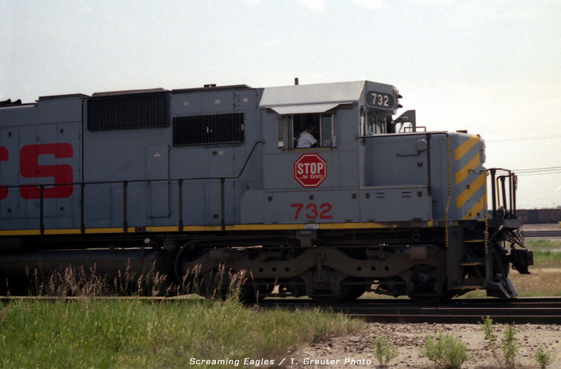 KCS 732 - moving over the westbound track at Hobson Yard. 7/1/95 - T. Greuter Photo · |