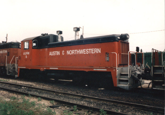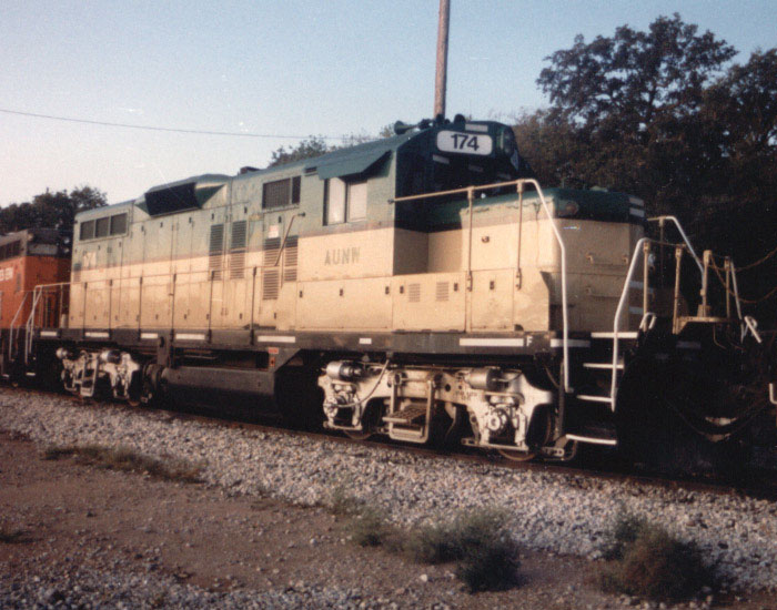 AUNW GP35m #66 is former Texas & Pacific #600 - It was later renumbered to MP 2500, then to MP 2617. It has traveled around to several roads, since it was retired by the MoPac. It was sent to the Texas Mexican Railroad in Corpus Christi, Texas, but the road refused the unit. It later went to the Austin & Northwestern, where it was used in service for some time. From there it was placed in service on the Dallas Garland & Northern Railroad. The unit has since been taken out of service by Rail America. AUNW #66 is seen in Austin, Texas in the early 90s. - Steve Rude Photo/Jay Glenewinkel Collection |