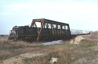 MP 1707 - a GP15 AC on southbound UP freight on the former Missouri Pacific Houston-Brownsville line (near Bloomington); February '86 - © Gary Morris PhotoAfter many years of successfully bearing the weight of the company's hopes and aspirations on their backs, the aging MoPac Geeps were one by one beginning to fall. In a an age of C-C power and mile-long coal trains, there was still a need for the low horsepowered road switcher. EMD had the answer when it introduced the GP15 as a replacement for GP7's, 9's and 18's all over the country.
