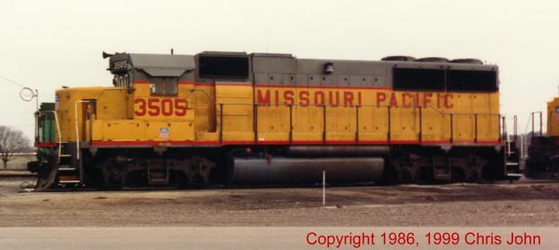 MP 3505 - GP50 repainted yellow with "Missouri Pacific" block lettering on the sides, later this lettering too would give way to "Union Pacific." - © copyright Chris John |