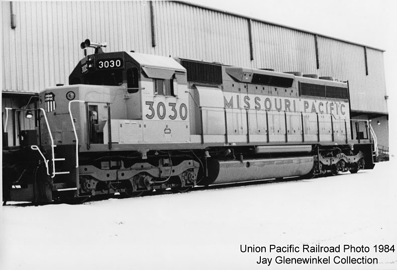 In that same month, a locomotive was needed for a test scheme. The task was to be done in North Platte, Nebraska. At the time, there were no MoPac units available, so a shopped Union Pacific SD40 #3030 was repainted and lettered "Missouri Pacific" using UPs standard rounded lettering.