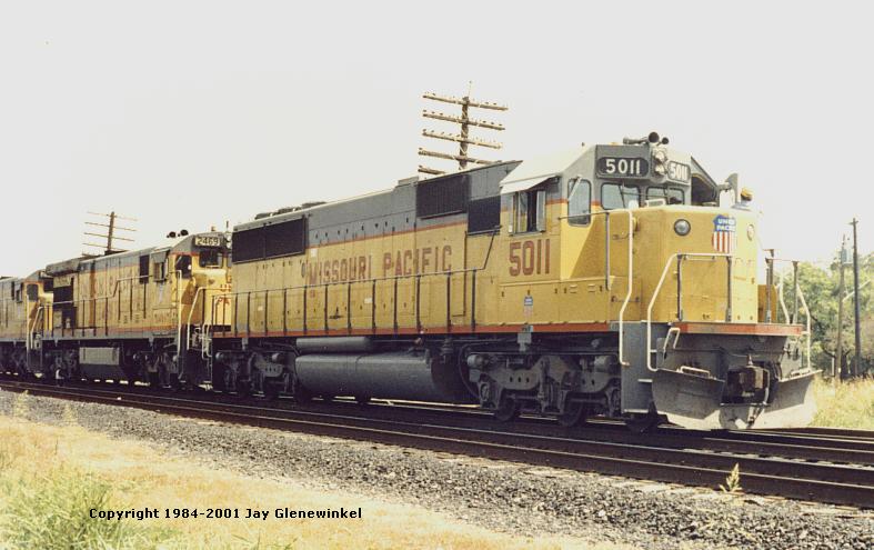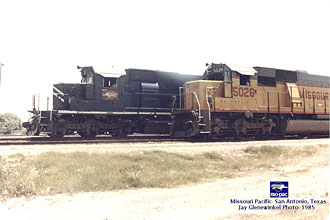 MoPac SD40-2 3102 passes by MP SD50 #5026 - as it departs San Antonio in 1985. - Jay Glenewinkel PhotoEven until today, the MoPac fleet was among the largest to come to the UP system, second only to the Southern Pacific's, which UP bought almost two decades later. Approximately two-thirds of that fleet is still in UP service as of January 1, 2001.