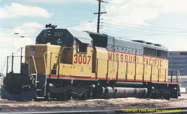 MP SD40 3007 - was built as MP 707 in 1967. It was renumbered to MP 3007. The 3007 was retired in 1991 by Union Pacific. It is pictured here at Centennial Yard in Fort Worth in 1985. - Jay Glenewinkel Photo |