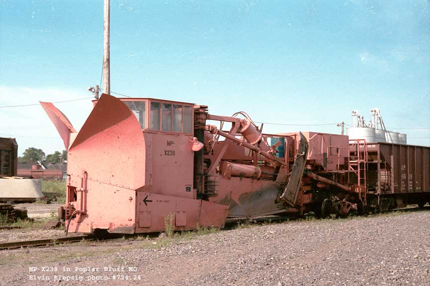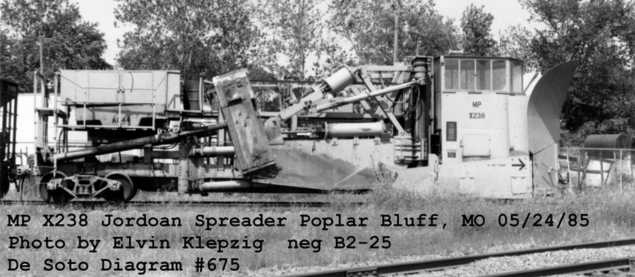MP X 238 - another view of MoPac's spreader at Poplar Bluff, Missouri on 5/24/85 - photo © copyright Elvin Klepzig, used with permission |