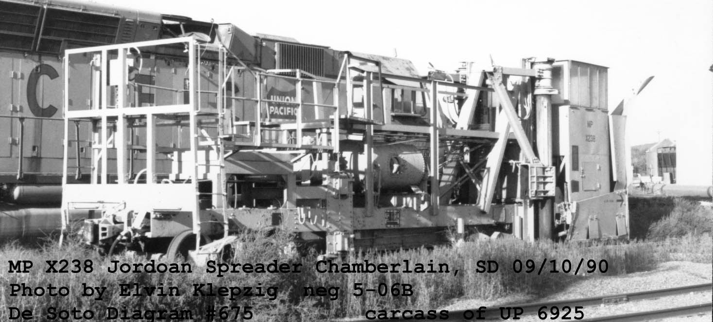MP X 238 - the Jordan Spreader in a third view, far from it's old stomping ground, this time at Chamberlain, South Dakota on 9/10/90. It's spirit departed, behind rests the remains of UP 6925. - photo © copyright Elvin Klepzig, used with permission |