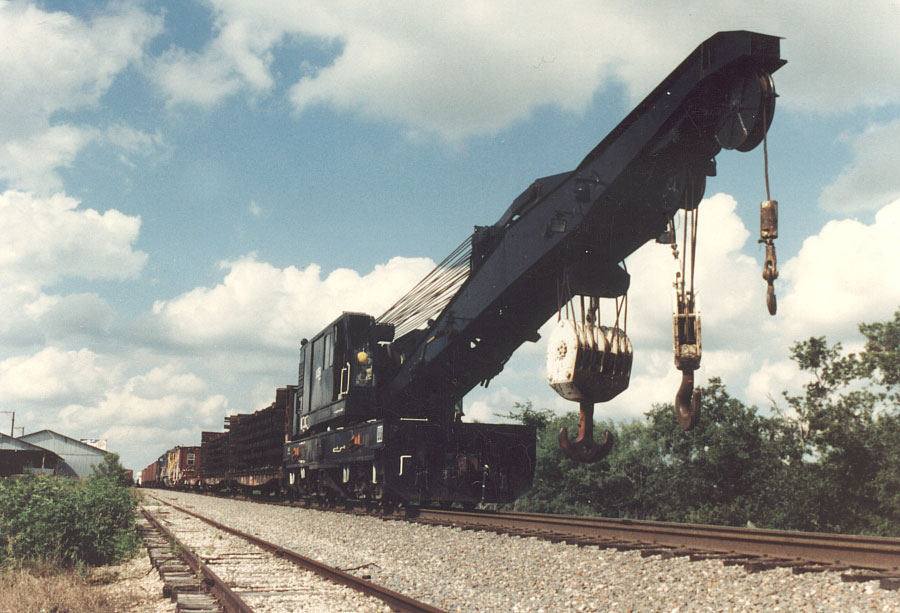 Missouri Pacific MofW crane - in route to a major derailment in 1988 in San Antonio, Texas. - Jay Glenewinkel Photo |