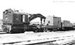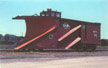 more than simple wedges on converted coal tenders. MP X186 was the only Russell snowplow MoPac ever owned. Russells were common in the east, but were comparatively rare on the great plains. The "elevator wings" on the sides were to widen the initial cut made by the plow. The actual flanger is the structure under the plow body ahead of the rear truck. There were ice cutters ahead of the front truck (which was inside-framed). The operator's main job was to raise the flanger blade when passing over a switch or a highway crossing, so it would not get torn up. (thanks to John La Rue, Jr.) |