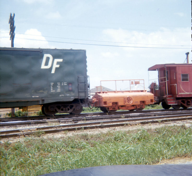 MP X 284 - at Ferriday, Louisiana on April 26, 1969. Its actual built date is unknown, though a similar car, Idler X 638, was built in 1936. The X 284 was retired in 6/71. - photo: John C. La Rue, Jr., used with permission. Contact John for a list of his r.r. photos. |