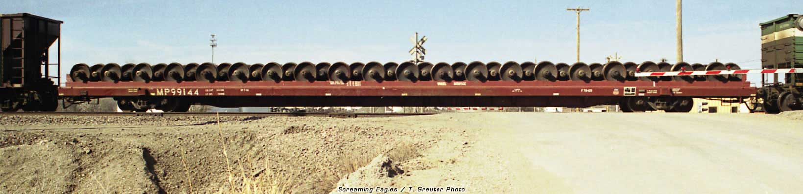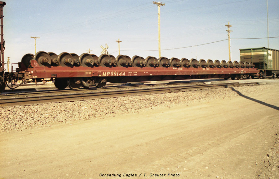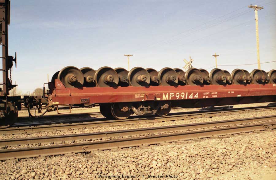 MP 99123 - Wheel car, from a modified Greenville flatcar (this may be a post-merger modification - though the series is correct for MP wheel cars), at Ames yard, Iowa; 2/17/01 - photo © RailArc |