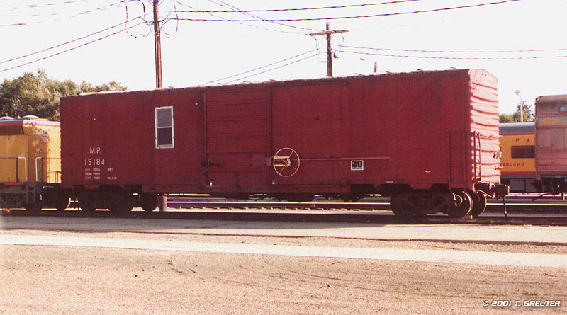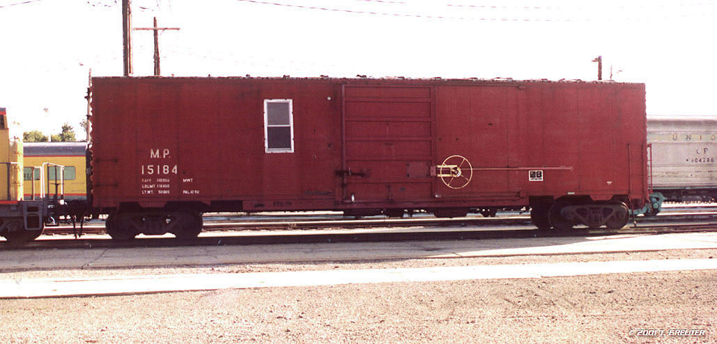 MP 15184 - Tool car; shows the modifications made to the 50' boxcar including a screen window and large cogged crank wheel for the sliding door. Council Bluffs, Iowa; 10/6/01 - Todd Greuter photo |